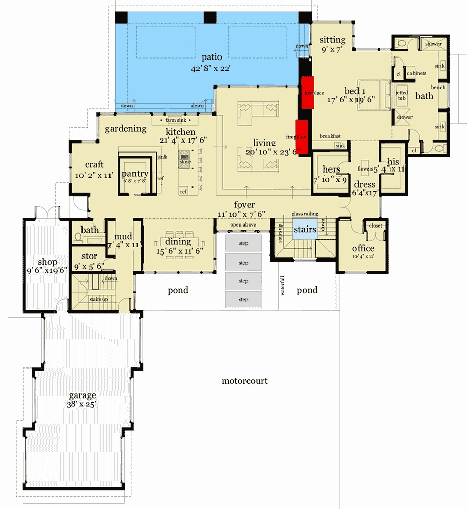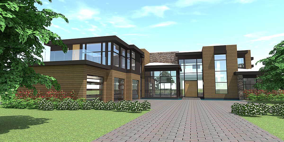This is a large modern house plan with a central 2 story living space. The entry walk steps across the reflecting pond and waterfall.