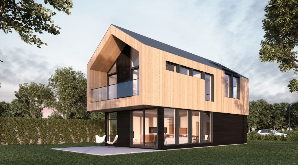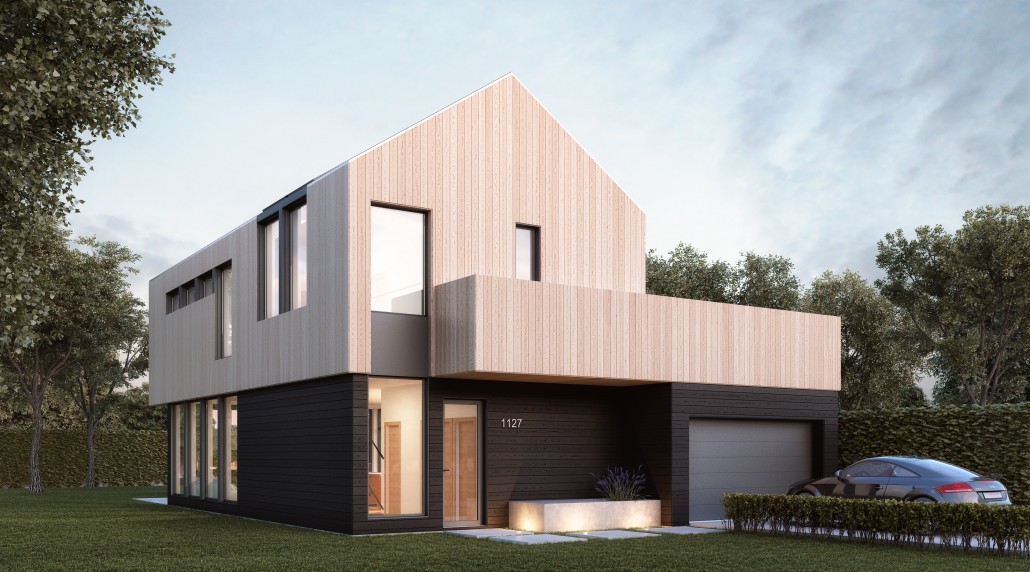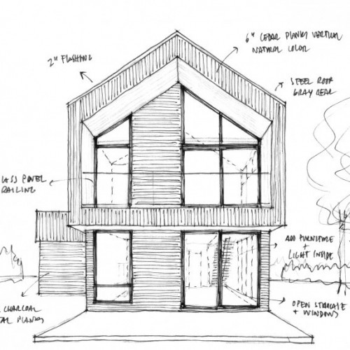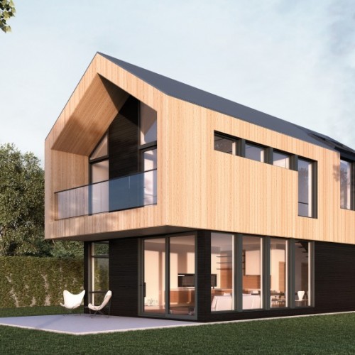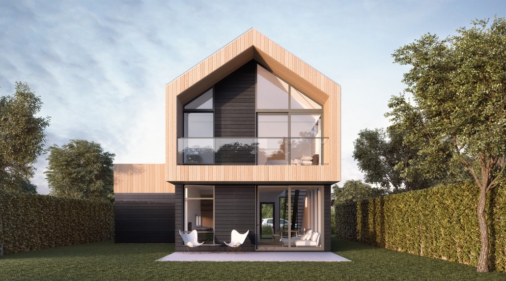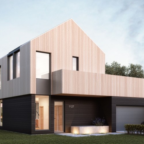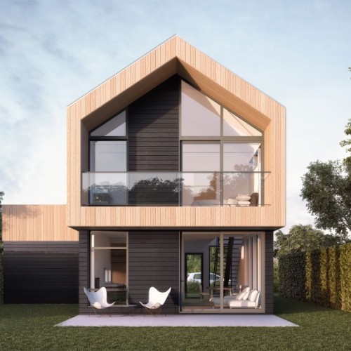 This inspiration has been designed for an urban or smaller country setting in a lot size usually around 50 feet long. There is a main open-plan living space with a garage attached. The large windows maximize natural light and enhance the feeling of interior space.