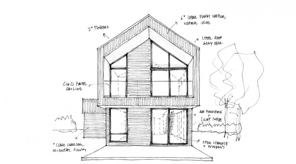 The second floor features a unique gable that overhangs 5′ beyond the ground floor, creating a covered exterior patio area. The wooden underside of the roof turns and continues uninterrupted into the balcony of the master bedroom, creating an extension of the overall shape.