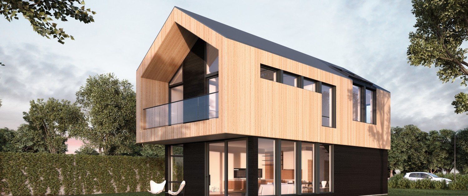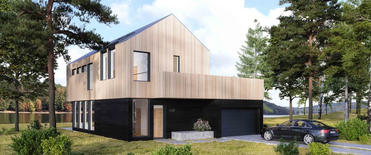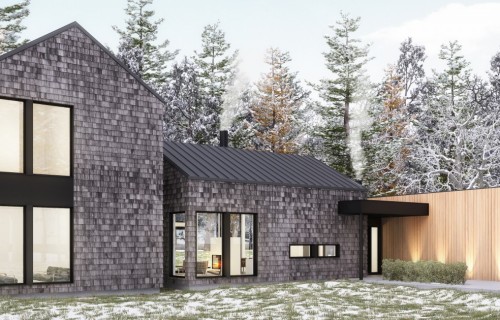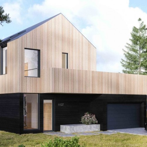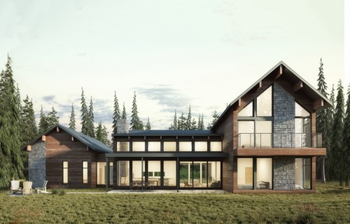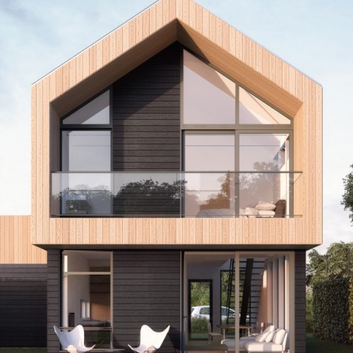 This inspiration has been designed for an urban or smaller country setting in a lot size usually around 50 feet long. There is a main open-plan living space with a garage attached. The large windows maximize natural light and enhance the feeling of interior space.