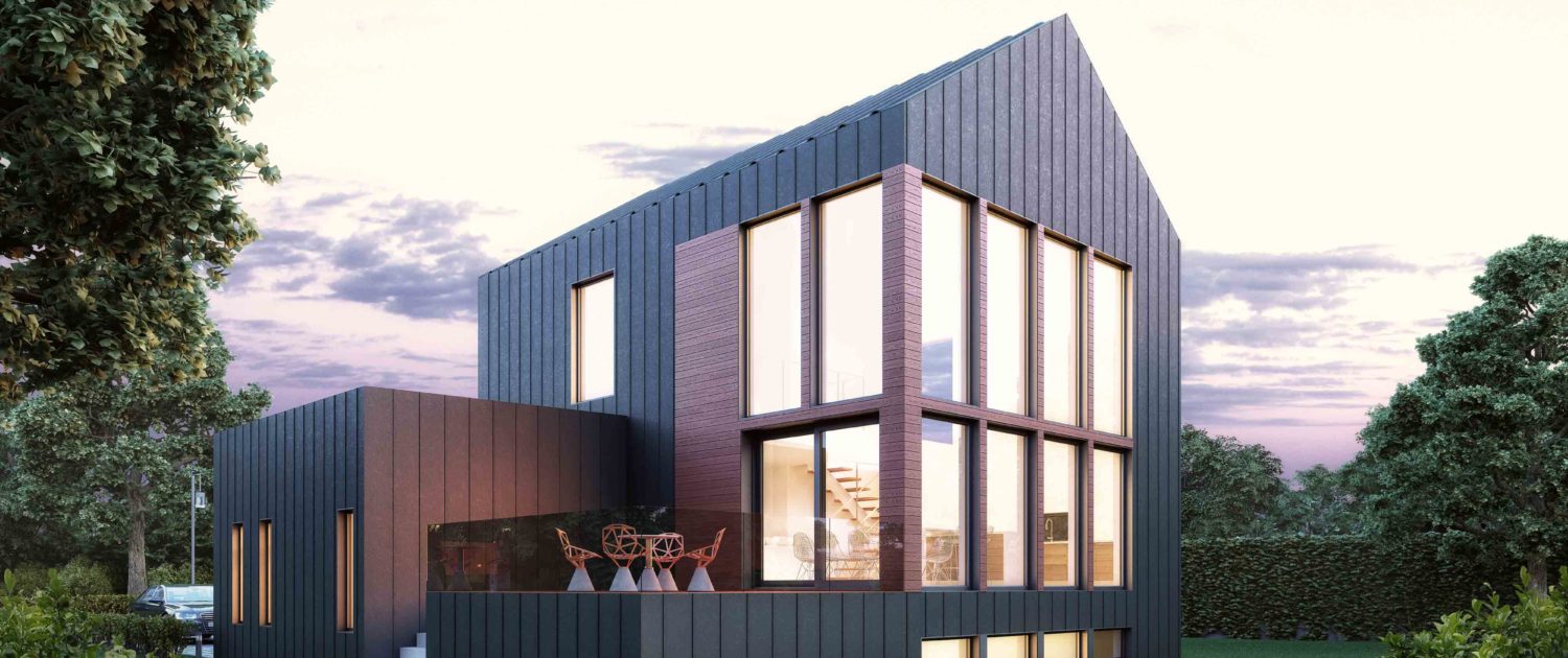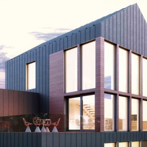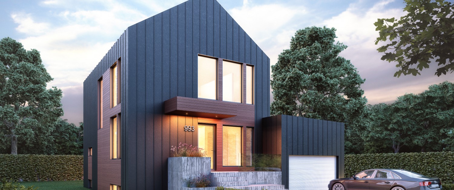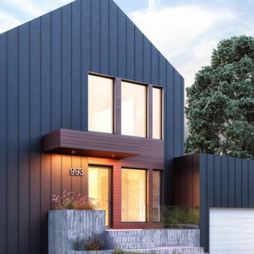 This inspiration has been designed for an urban or smaller country setting in a lot size usually around 50 feet long. There is a main open-plan living space with a garage attached. The model’s large windows maximize natural light and enhance the feeling of interior space. Its dark grey steel with reddish wood planks for the facade give it an urban feel that is also reminiscent of a barn-style country home.