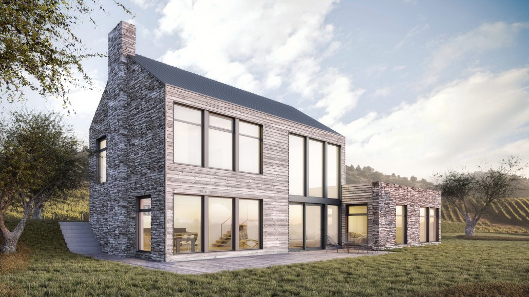 From the outside, this country home is striking for its juxtaposition of traditional natural wood and local stone. Oversized windows allow light to flood the interior spaces, while its location on a sloping lot offers fantastic views of the surrounding countryside. The whole house forms an angle that embraces a huge private patio at the lower level and features two volumes, one a main living space on two floors with a fireplace as a focal point, the other a broad horizontal volume connected to the garage.
