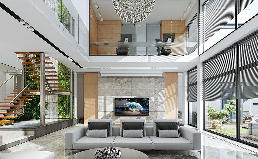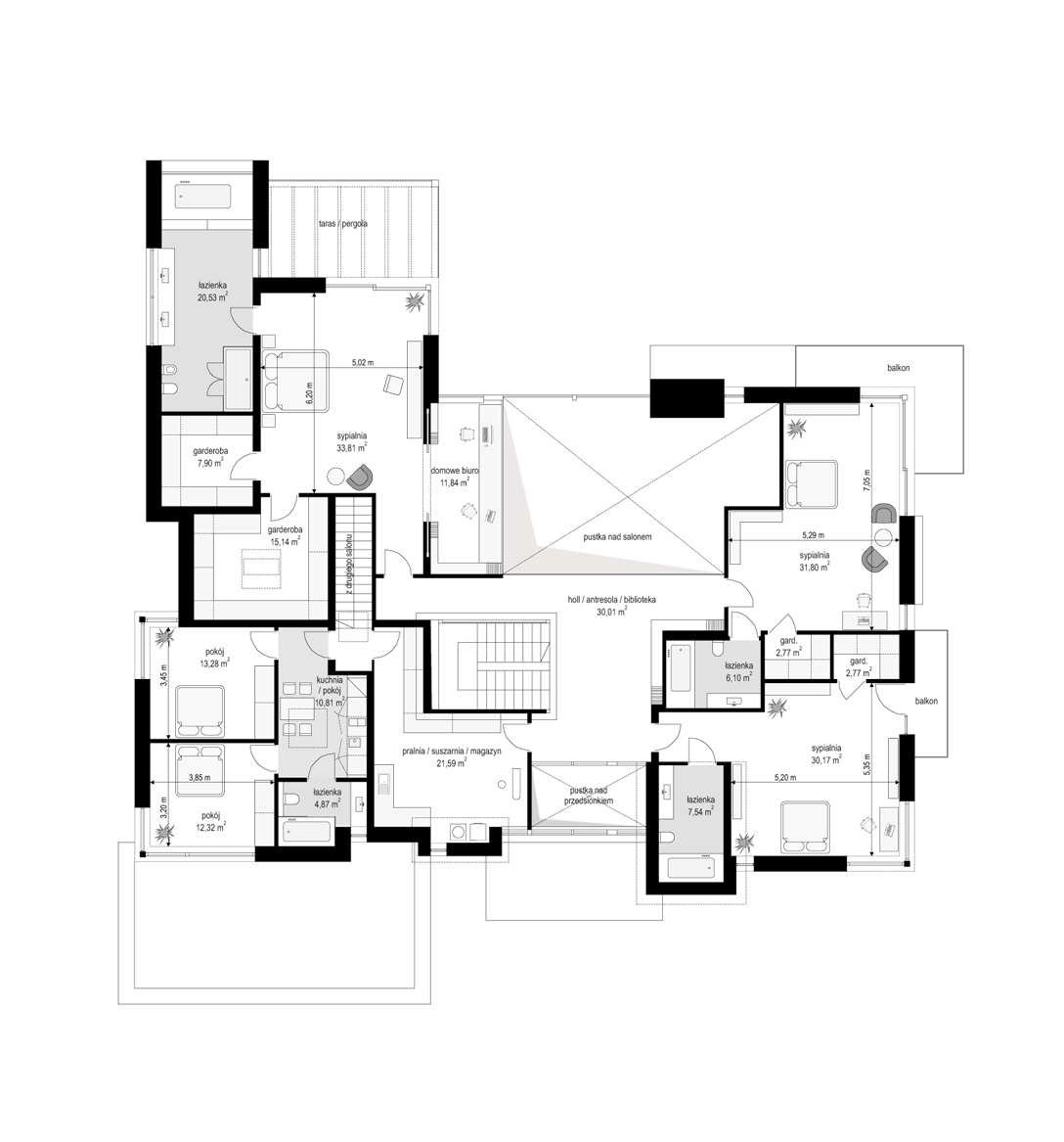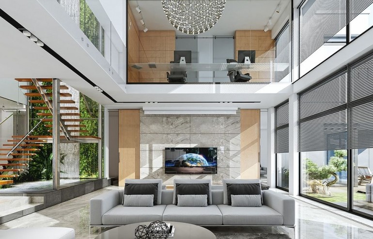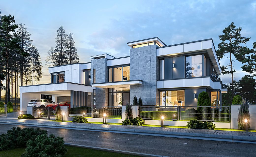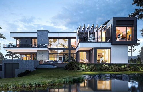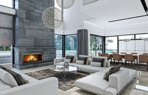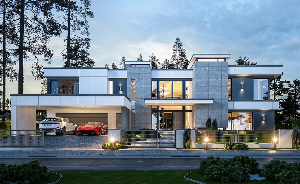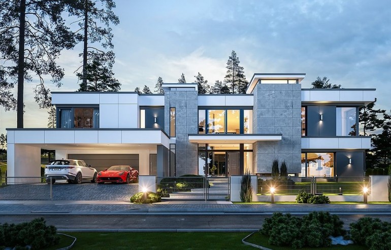 House design Florida Residence 2 is another luxurious house from the series: Villa and Residence Florida. We have designed a super-comfortable villa with modern architecture, flat roofs and large glass walls connecting a representative interior with a garden. The leading idea of shaping the body and interior of the building is the interpenetration of rectangular walls and horizontal panels with openings and glazing, creating a play of lights and framing views of the interior and surroundings. Thanks to this assumption, the building is more interesting and less monotonous. At the same time, the whole architecture is closed in a network of consistently repeating details, giving the entire structure an appropriate rhythm and order. Florida 2 Residence, although it has a very modern style, is not overly extravagant. The architecture of the building can be a good background for both a modern interior and a more eclectic one - broken with antiques or a glamor-style arrangement. The serene and sober style of the house will certainly stand the test of time. We enter the Florida Residence 2 through a two-story glazed vestibule to the hall, over which the first floor forms a bridge - a mezzanine between two voids: the living room and vestibule, and the front and garden glazed facade. Such an interior divides the building into half with a two-story open living room. On the right, on the ground floor, we have a large family kitchen and a dining room, and on the first floor there are children's bedrooms. On the left side of the residence there is an economic and technical part, as well as a recreational and fitness part, and on the first floor there is an apartment of your home, and a separate apartment with a separate intimate access - for home service or guests. The central lounge of the villa blends with several other interiors on the ground and upper floors, creating a truly huge, free space for everyday life. Here we have two sets of lounge furniture - by the fireplace and by the multimedia wall. The living room is connected with the dining room and kitchen, the hall is decorated with monumental stairs, leaning against a stone and water wall - a waterfall with a water tank at the foot of the stairs (the water wall and the tank are the natural air conditioning of the interior building). The living room is also connected with the hall on the first floor (which is the home library), and with the office - through an impressive glass wall. The living room also opens onto the garden and terraces of various heights, a jacuzzi and a swimming pool. Upstairs, the parents' and children's apartments have their own bathrooms and wardrobes. The master bedroom has wardrobes for him and her. Florida Residence 2 is a one hundred percent luxurious house, fulfilling the dream of a truly comfortable and convenient life. The Florida 2 Residence is a showcase of the owners, confirming their high status and good taste. We are already jealous and admire the lucky ones who can afford to build this gem.