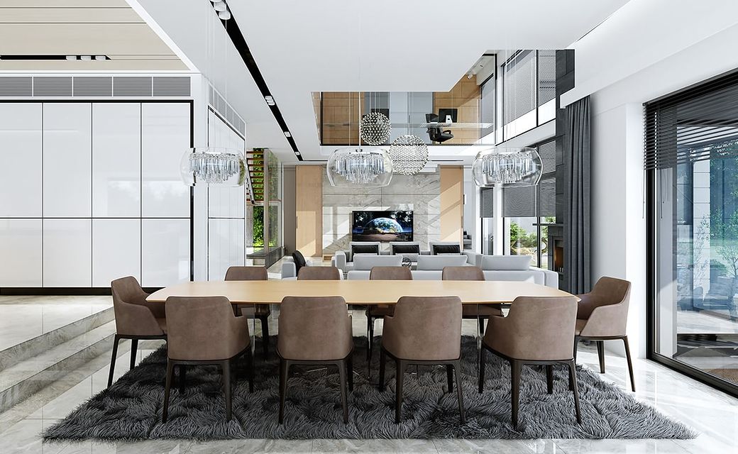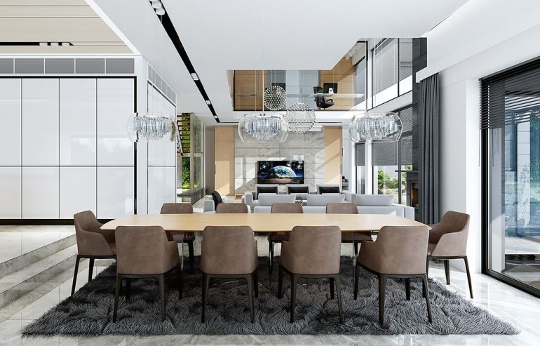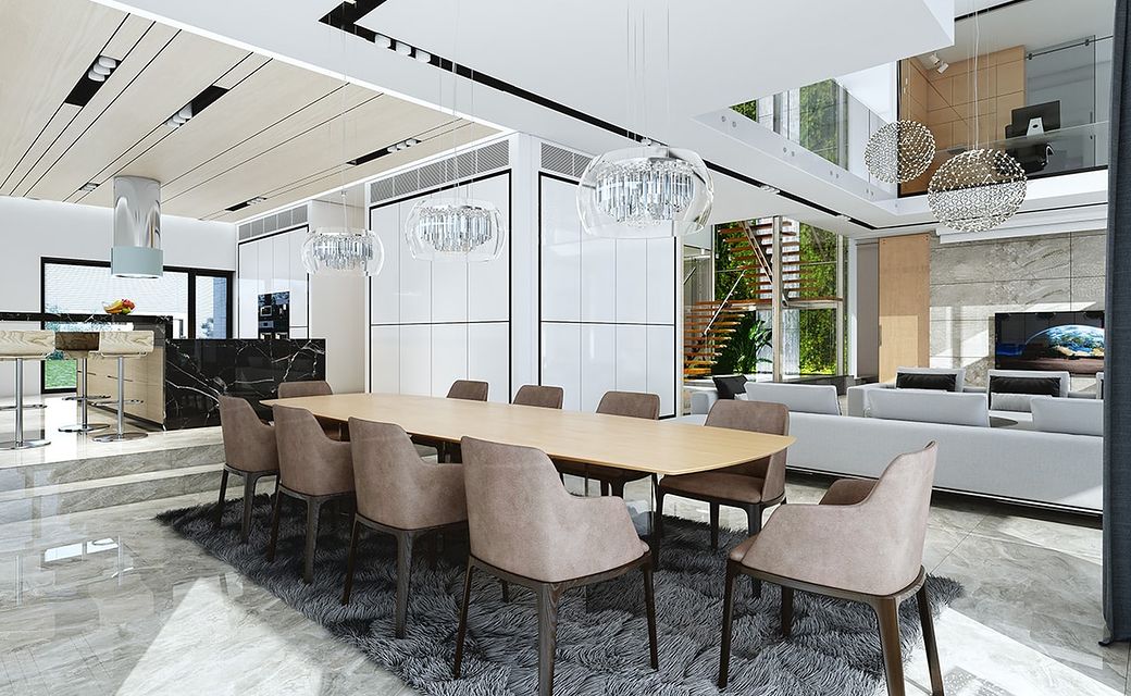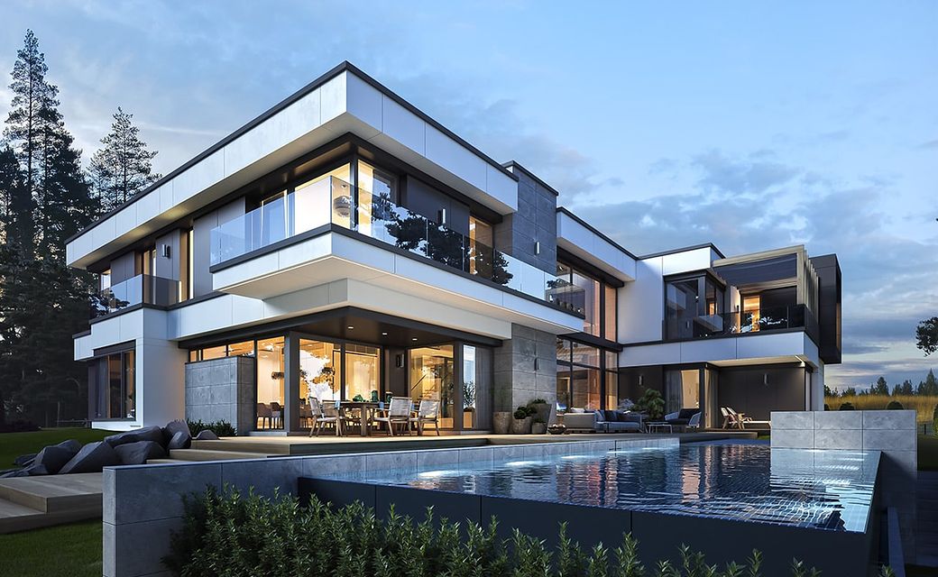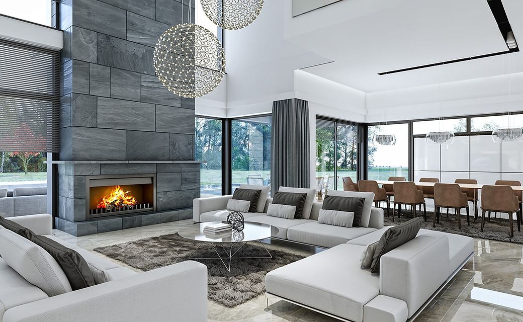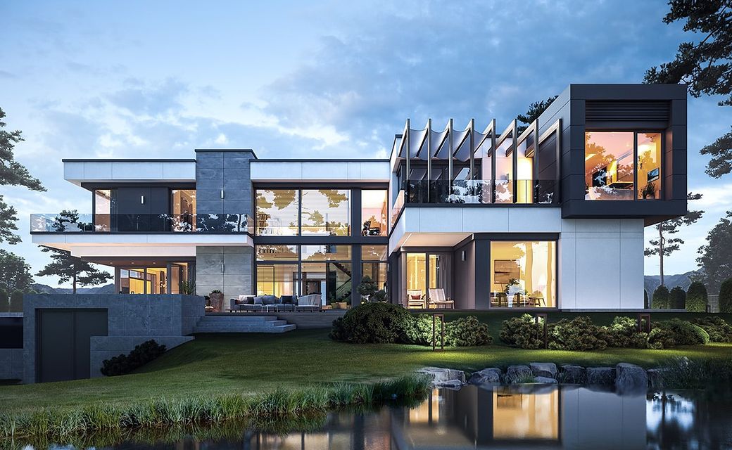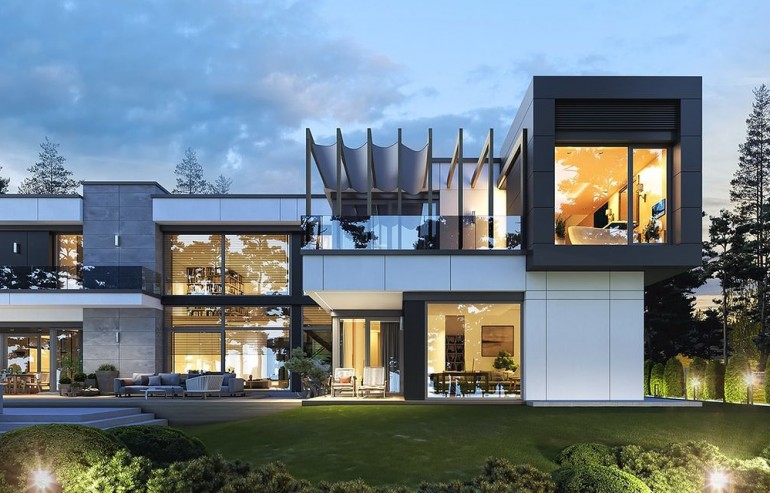 House design Florida Residence 2 is another luxurious house from the series: Villa and Residence Florida. We have designed a super-comfortable villa with modern architecture, flat roofs and large glass walls connecting a representative interior with a garden. The leading idea of shaping the body and interior of the building is the interpenetration of rectangular walls and horizontal panels with openings and glazing, creating a play of lights and framing views of the interior and surroundings. Thanks to this assumption, the building is more interesting and less monotonous. At the same time, the whole architecture is closed in a network of consistently repeating details, giving the entire structure an appropriate rhythm and order. Florida 2 Residence, although it has a very modern style, is not overly extravagant. The architecture of the building can be a good background for both a modern interior and a more eclectic one - broken with antiques or a glamor-style arrangement. The serene and sober style of the house will certainly stand the test of time. We enter the Florida Residence 2 through a two-story glazed vestibule to the hall, over which the first floor forms a bridge - a mezzanine between two voids: the living room and vestibule, and the front and garden glazed facade. Such an interior divides the building into half with a two-story open living room. On the right, on the ground floor, we have a large family kitchen and a dining room, and on the first floor there are children's bedrooms. On the left side of the residence there is an economic and technical part, as well as a recreational and fitness part, and on the first floor there is an apartment of your home, and a separate apartment with a separate intimate access - for home service or guests. The central lounge of the villa blends with several other interiors on the ground and upper floors, creating a truly huge, free space for everyday life. Here we have two sets of lounge furniture - by the fireplace and by the multimedia wall. The living room is connected with the dining room and kitchen, the hall is decorated with monumental stairs, leaning against a stone and water wall - a waterfall with a water tank at the foot of the stairs (the water wall and the tank are the natural air conditioning of the interior building). The living room is also connected with the hall on the first floor (which is the home library), and with the office - through an impressive glass wall. The living room also opens onto the garden and terraces of various heights, a jacuzzi and a swimming pool. Upstairs, the parents' and children's apartments have their own bathrooms and wardrobes. The master bedroom has wardrobes for him and her. Florida Residence 2 is a one hundred percent luxurious house, fulfilling the dream of a truly comfortable and convenient life. The Florida 2 Residence is a showcase of the owners, confirming their high status and good taste. We are already jealous and admire the lucky ones who can afford to build this gem.