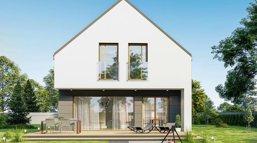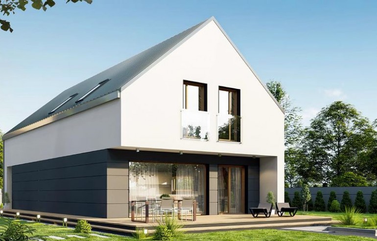 House plan with attic Slim A2G with a spacious garage, gable roof, terrace.