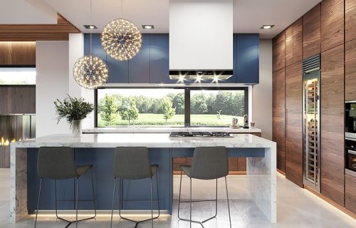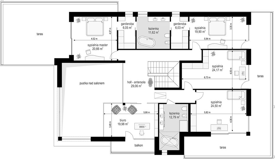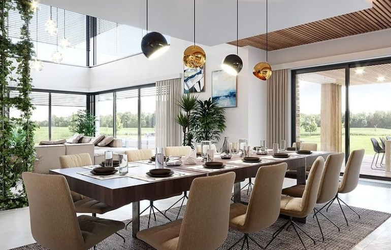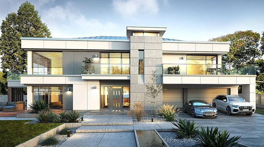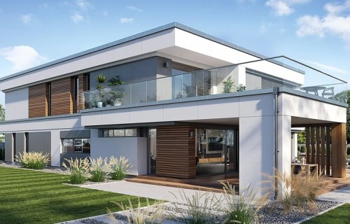 The Villa Florida 5 house plan is another luxury mansion project from the "Willa Florida" series. The house is a comfortable, two-story villa, intended for a plot with a side or front garden. The architecture of the house combines a modern form with a functional interior. Stylish, varied shape and representative interior will emphasize the status and good taste of the owners. The fragmented two-story silhouette of the house is covered with a hipped roof, practically invisible from the height of human eyes, giving the impression of a building with a flat roof, with - in fact, a sloping roof (a frequent requirement in the building conditions). The elevations have been divided into strips of windows interwoven with white beams separating the storeys, introducing rhythm and order. We enter the building through elegant wide entrance doors with side lights under the balcony roof. The front of the house is decorated here with a vertical two-story wall with skylight, large windows in the corners of the facade, and a comfortable carport in front of the three-car garage. The garden façade in Villa Flory 5 is the side façade of the house with a large covered terrace - a place for evening feasts, and large corner glazing of the living room. The interior of the ground floor is primarily a huge single-space area of the hall, living room, dining room and kitchen rooms. It is almost 150 m2 of free, open living space. There is a representative staircase to the first floor, a living room with a large void and opening to the mezzanine above, with a delightful lounge suite and a TV wall. We have a dining room with a table for 14 or more people and a beautiful gas fireplace, we have a kitchen with an island, and a garden in the center for representative plants, and plenty of space to display unique paintings and other works of art. Everything is bathed in the light of wide, two-story glazing. In the back room, behind the kitchen, we have utility rooms such as a laundry room, pantry or boiler room. At the entrance: a cloakroom, toilet and access to a three-car garage. The first floor is the master bedroom with wardrobes and a bathroom, and an additional spare room and two children's bedrooms with their own second bathroom. A beautifully glazed home office or library room hangs above the living room, and a mezzanine opening onto the ground floor and the garden. All rooms on the first floor have access to the surrounding terraces. The master bedroom has a separate very large terrace overlooking the garden. Willa Flory 5 is another proposal of a large luxury house for brave Investors who want to fulfill their dreams of a unique place to live, who want to enjoy remarkable - modern at the same time non-flashy and tasteful architecture.