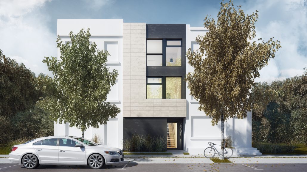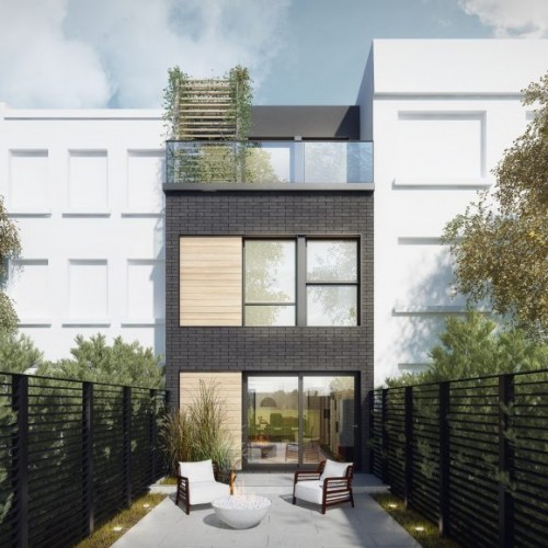 This inspiration features a triple-height void along the staircase topped by a skylight that offers natural light throughout the floors. There are two bedrooms that share a bathroom on the first floor and a master bedroom on the upper floor.