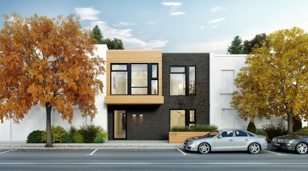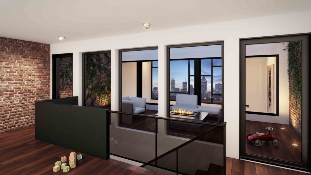 This inspiration has an interior courtyard on the top floor inside the building, with double-height ceilings at the back of the building in the living room and dining room. The latter features a 20-foot patio door and a glass curtain wall leading out to a backyard JNCN HOMES pergola.