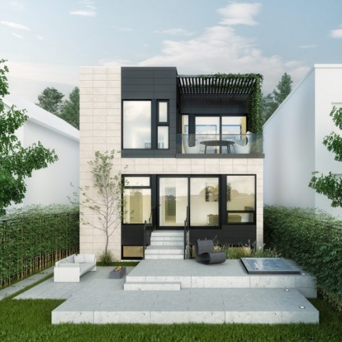 The living room at the front of the building features a fireplace and is cantilevered over the entrance and leads through to the master bedroom with an open bathroom, a walk-in closet and a TV room facing the interior courtyard. The corridor leading to the large master bedroom has a double-height ceiling with natural light from a full glass wall that looks through to the interior courtyard. The first floor kitchen and dining room are separated from the living room by the interior courtyard and staircase, while a backyard patio is covered for privacy with a JNCN pergola that extends the kitchen area to form an urban garden. The home also features two bedrooms, a shared bathroom, and a laundry/utility room, with a mudroom shared between the garage entrance and the main entrance.