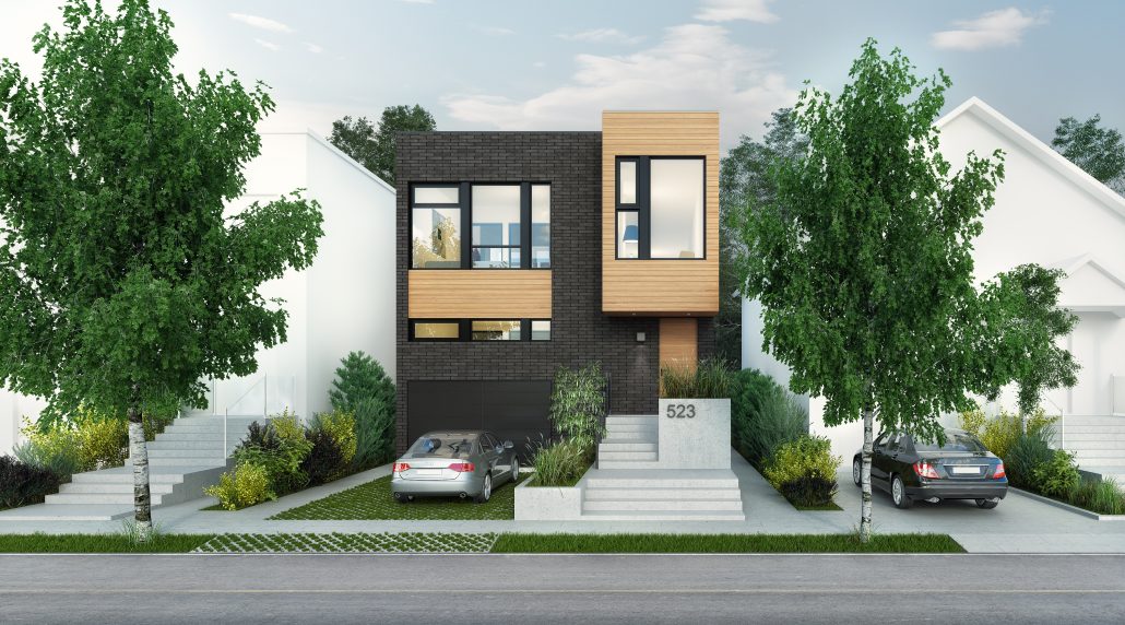 This inspiration has an interior courtyard that separates the kitchen and dining room at the back from the living room at the front of the building. There is a social space with higher ceilings on the upper floor and a single-car garage with a mudroom.