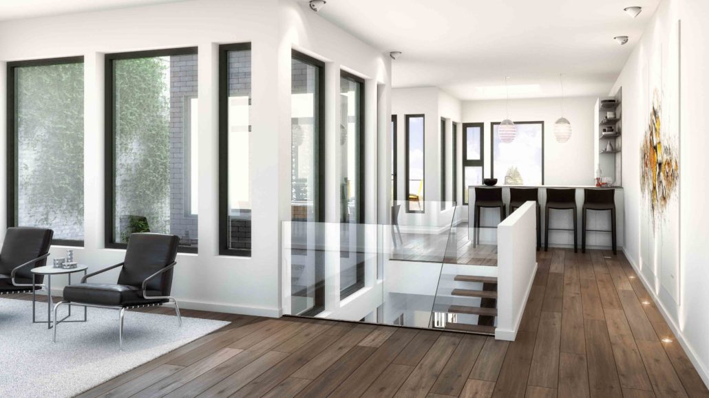 This inspiration has an interior courtyard that separates the kitchen and dining room at the back from the living room at the front of the building. There is a social space with higher ceilings on the upper floor and a single-car garage with a mudroom.
