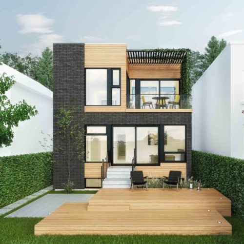 This inspiration has an interior courtyard that separates the kitchen and dining room at the back from the living room at the front of the building. There is a social space with higher ceilings on the upper floor and a single-car garage with a mudroom.