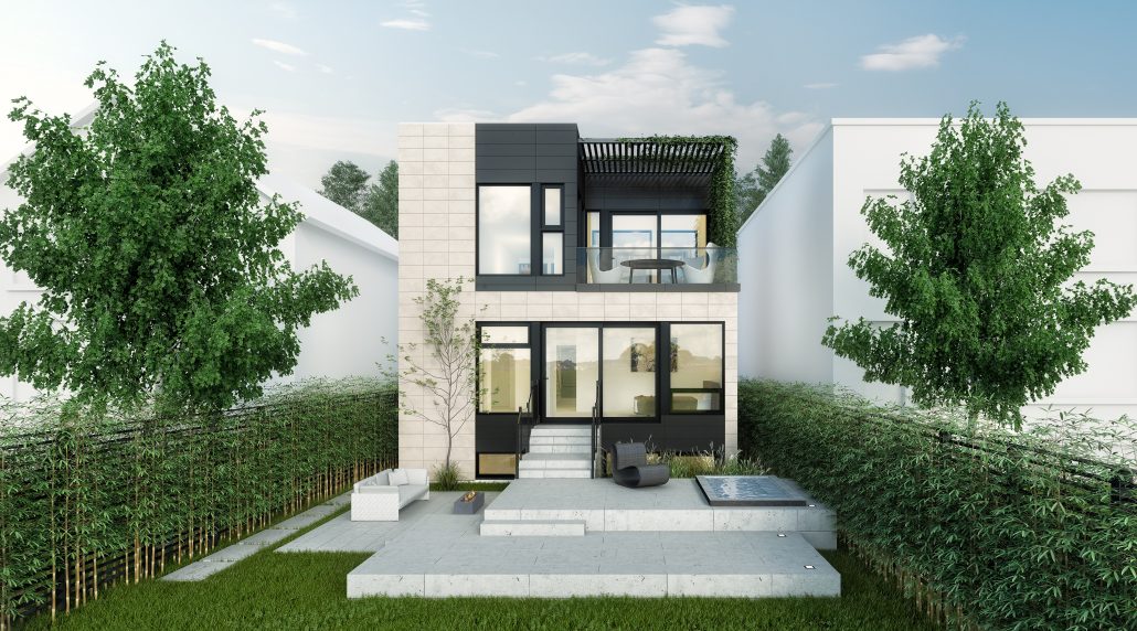 The living room at the front of the building features a fireplace and is cantilevered over the entrance and leads through to the master bedroom with an open bathroom, a walk-in closet and a TV room facing the interior courtyard. The corridor leading to the large master bedroom has a double-height ceiling with natural light from a full glass wall that looks through to the interior courtyard. The first floor kitchen and dining room are separated from the living room by the interior courtyard and staircase, while a backyard patio is covered for privacy with a JNCN pergola that extends the kitchen area to form an urban garden. The home also features two bedrooms, a shared bathroom, and a laundry/utility room, with a mudroom shared between the garage entrance and the main entrance.