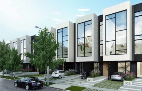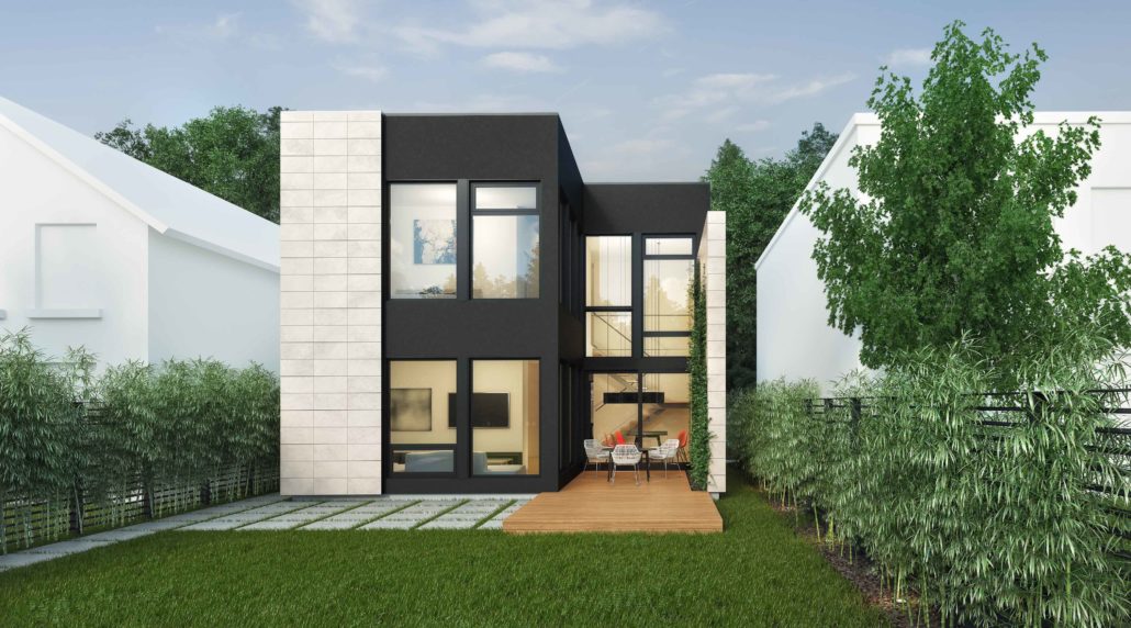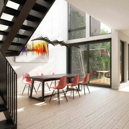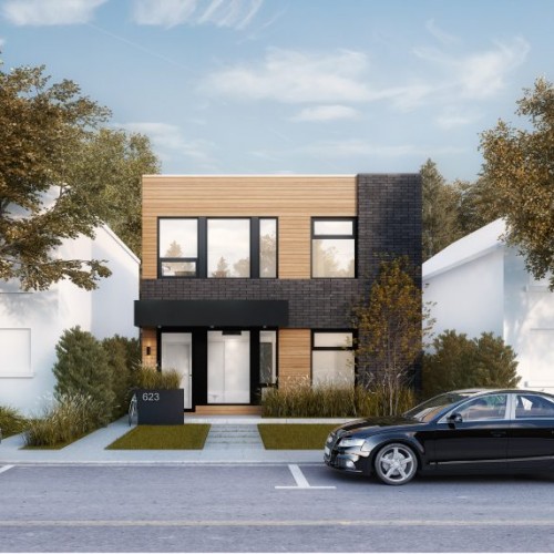With ample natural light provided by a cutout and double-height glass wall at the rear of the building, the design of this inspiration strikes a perfect balance between creative use of interior space and mood-enhancing light. From an entrance through a mudroom and laundry room, the main floor’s social space is open concept, with a dining room situated on the double height between the staircase and backyard patio, and the living room further back, separated from the kitchen by a fireplace. On the upper floor, the staircase divides the spaces, with the master bedroom at the back of the house and the other two bedrooms at the front. The master bedroom features an open-concept bathroom to catch natural light from the double-height glass wall.