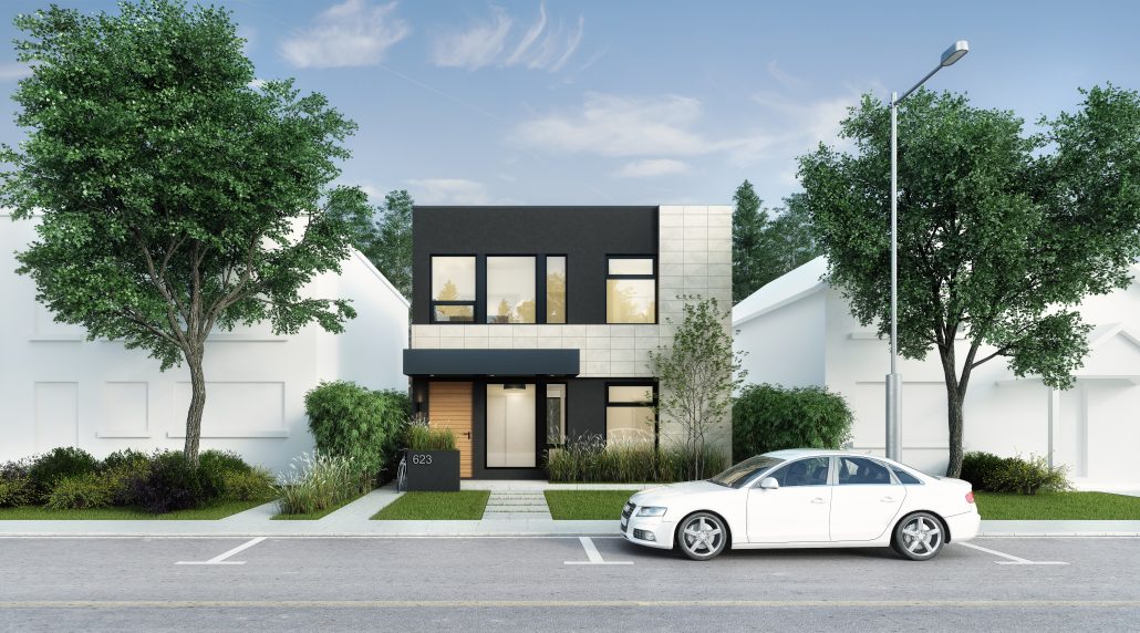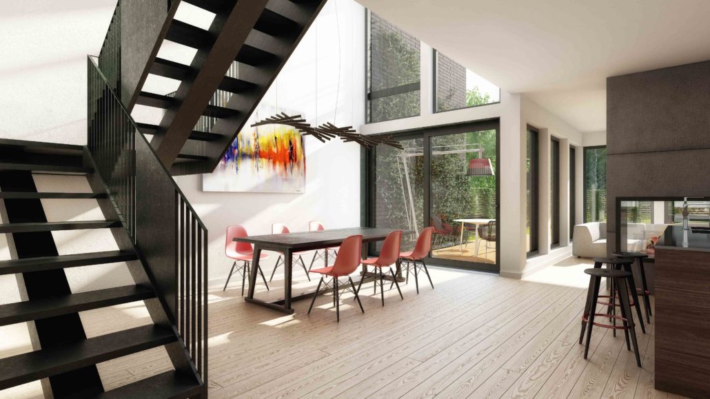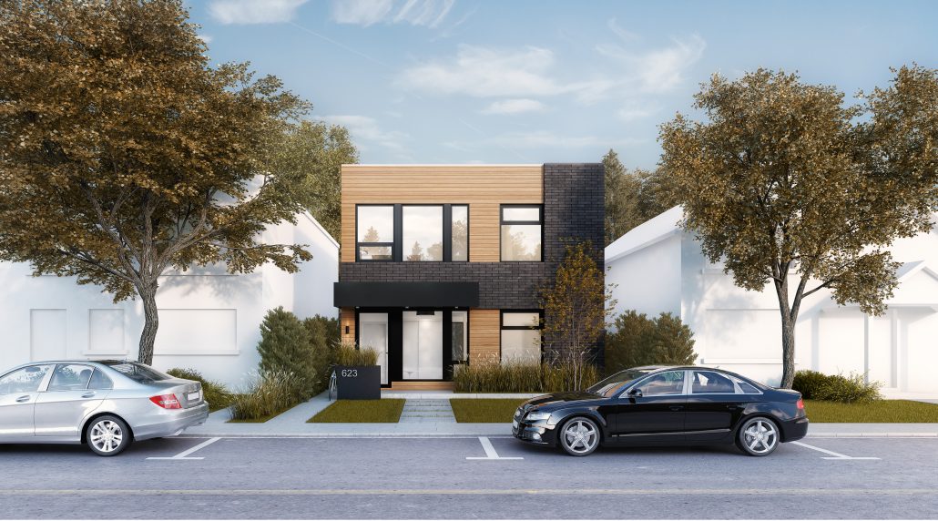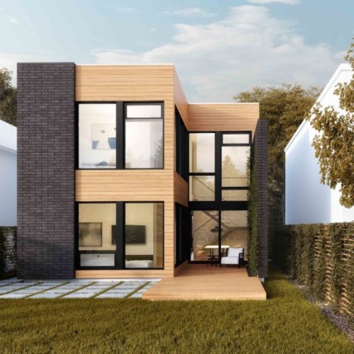 With ample natural light provided by a cutout and double-height glass wall at the rear of the building, the design of this inspiration strikes a perfect balance between creative use of interior space and mood-enhancing light. From an entrance through a mudroom and laundry room, the main floor’s social space is open concept, with a dining room situated on the double height between the staircase and backyard patio, and the living room further back, separated from the kitchen by a fireplace. On the upper floor, the staircase divides the spaces, with the master bedroom at the back of the house and the other two bedrooms at the front. The master bedroom features an open-concept bathroom to catch natural light from the double-height glass wall.