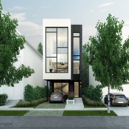 From the outside, the remarkable features are a large cantilever that forms a covering for the car port and smaller one extending from the living room to cover the entrance. Since the kitchen and dining area are on the top floor, we incorporated a service elevator from the main floor laundry room to the pantry on the upper floor. The social spaces have much more light because they are on the top floor, and natural light floods in through double-height living room windows.