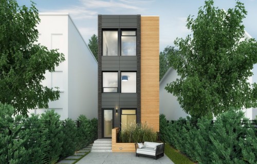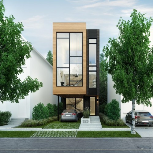 The standout feature of this inspirationis a reversal of the traditional story configuration, with the bedrooms in the basement and ground floor, and the kitchen, dining room and office situated on the top floor. The first floor has a double-height master bedroom with a curtain glass wall looking out onto the street.