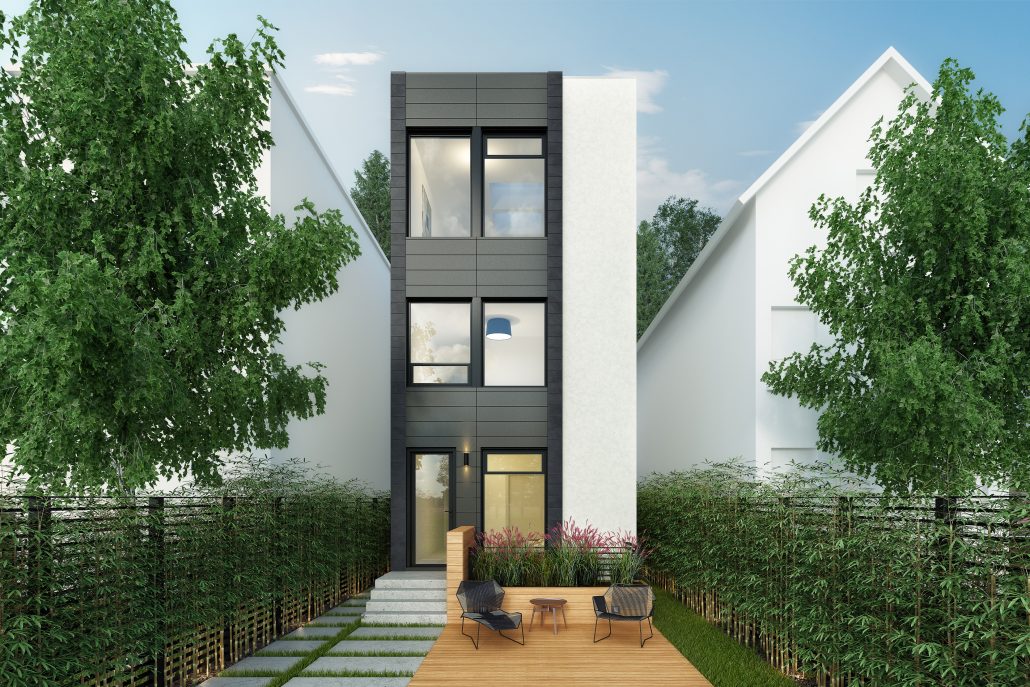 From the outside, the remarkable features are a large cantilever that forms a covering for the car port and smaller one extending from the living room to cover the entrance. Since the kitchen and dining area are on the top floor, we incorporated a service elevator from the main floor laundry room to the pantry on the upper floor. The social spaces have much more light because they are on the top floor, and natural light floods in through double-height living room windows.