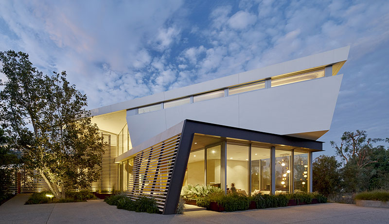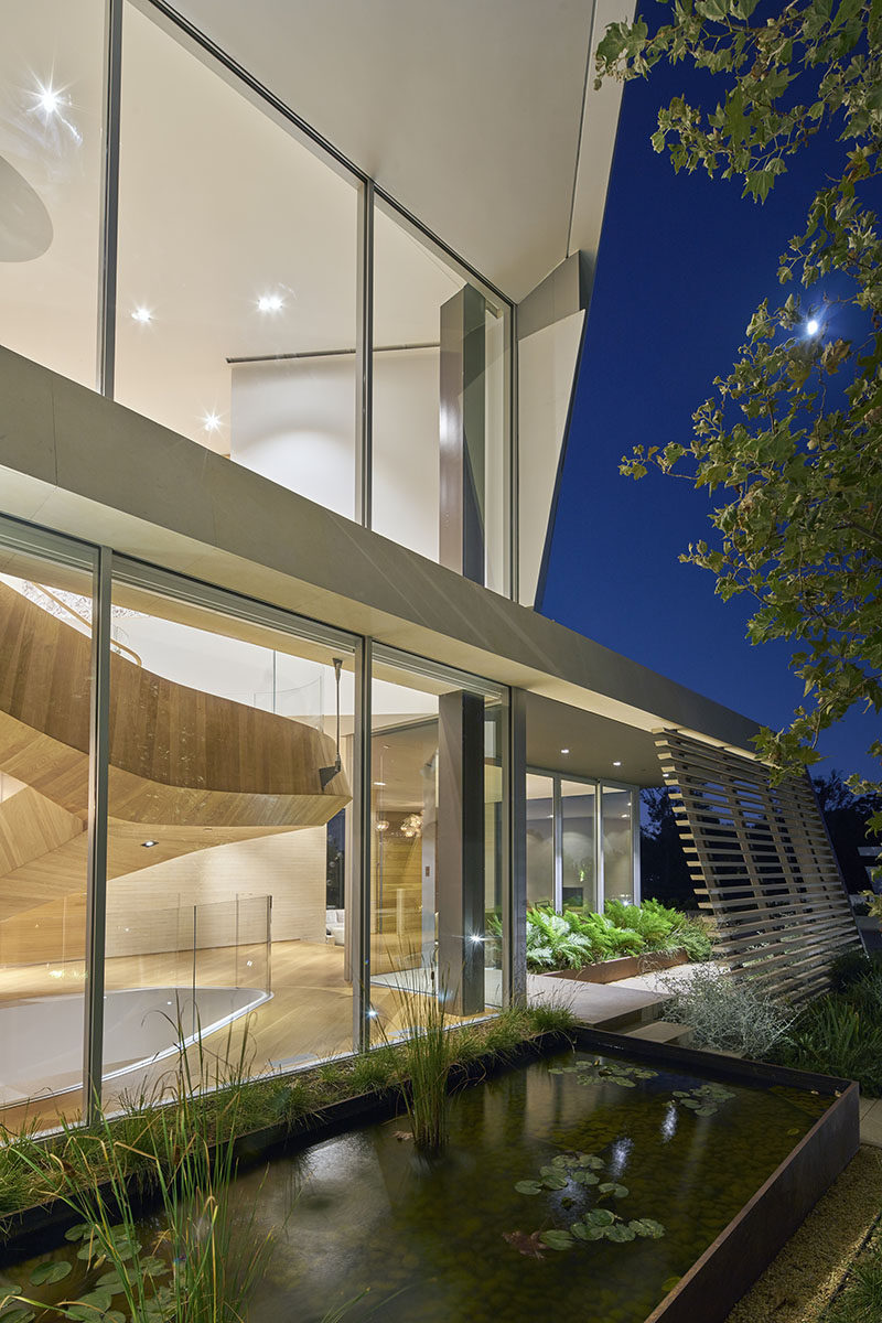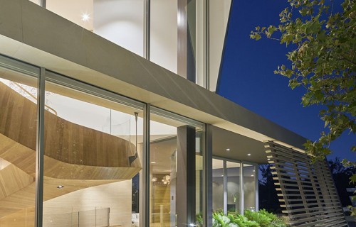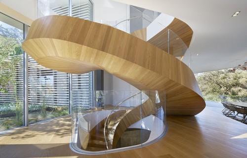A sculptural wood spiral staircase welcomes visitors to this house in Los Angeles