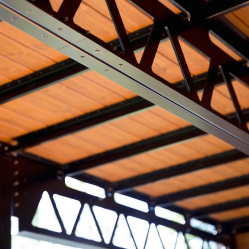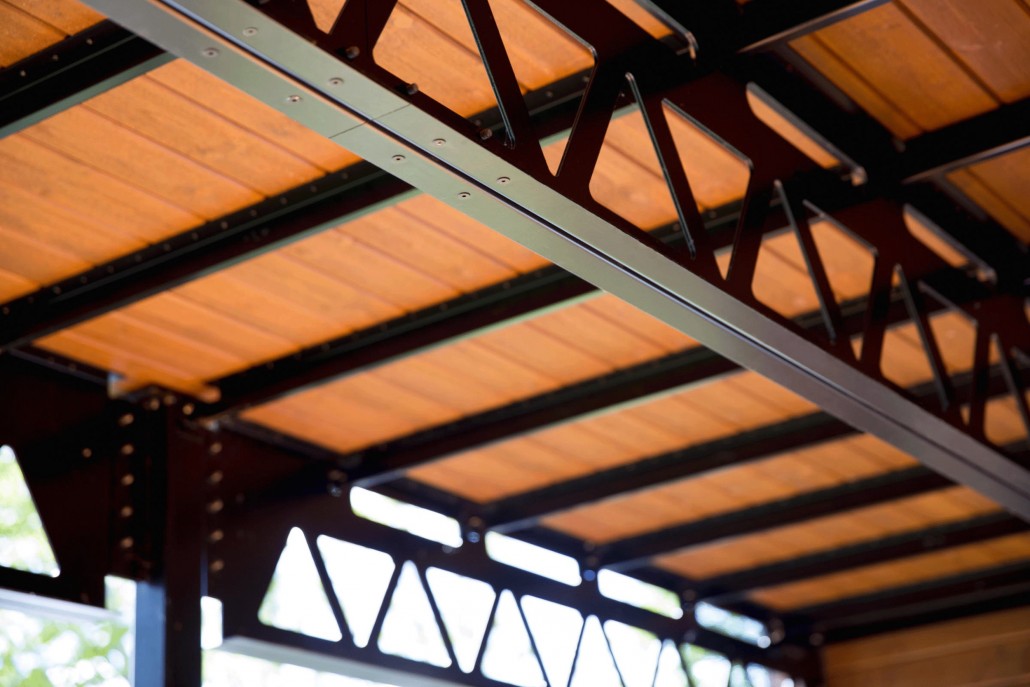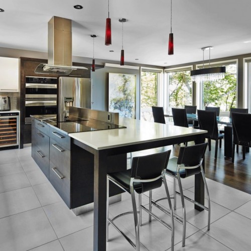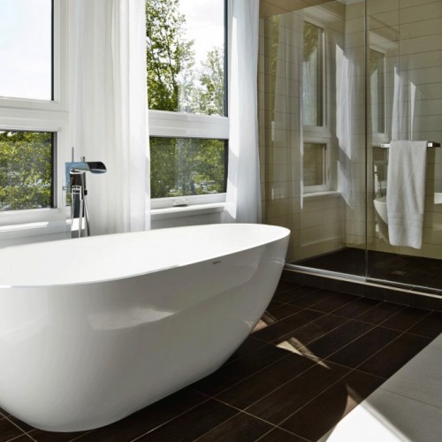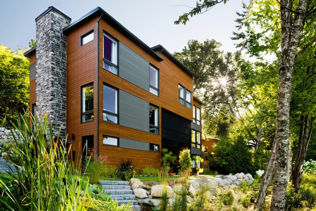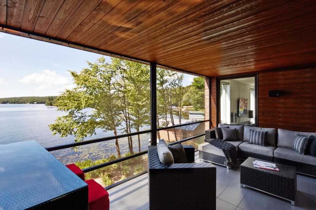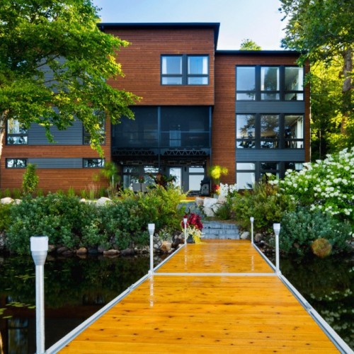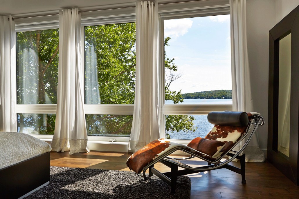 A lakeshore property with breathtaking views all around every floor, this country house is home to a couple with two small children. An eye-opening feature is the stylish staircase leading up from the large first-floor living room. The beautiful open-plan kitchen adjoins the dining room and living area, while the upstairs master bedroom also benefits from the view through massive windows. A basement provides additional living space, while the back of the house is fenestrated downward toward an original deck in the backyard.
