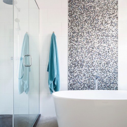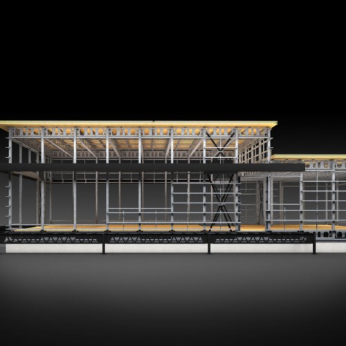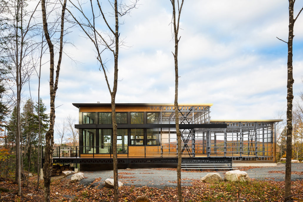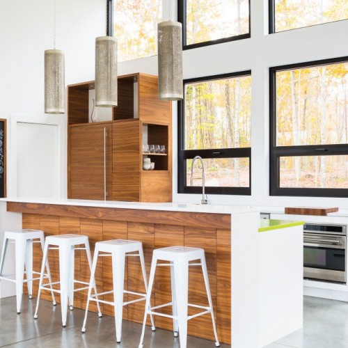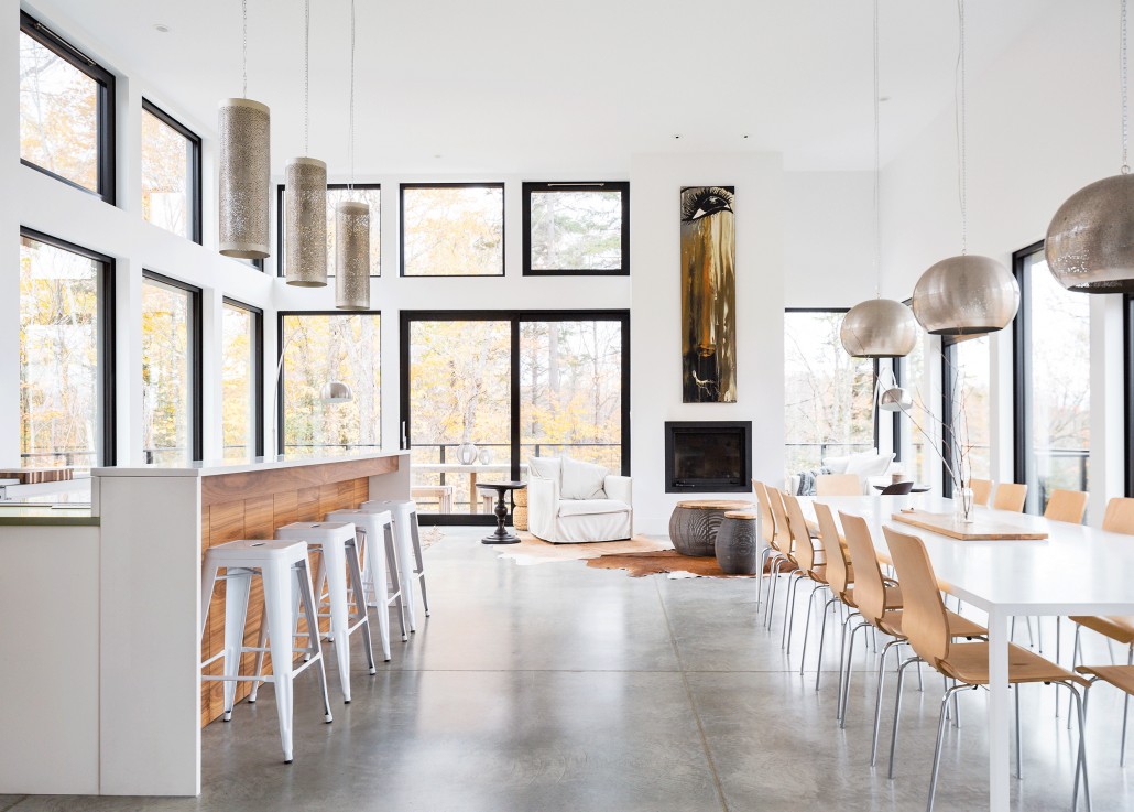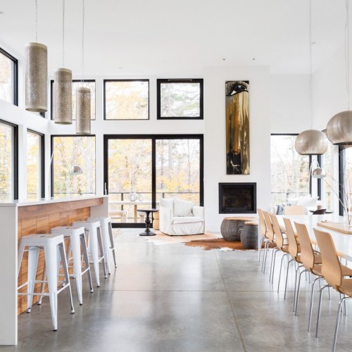 The wrap-around balcony encourages the occupants to step outside and enjoy the natural view of the Laurentians. Indoors, they continue to breathe easy in the completely open-concept main floor. The sense of peace comes from a combination of the open floor plan and the 15’ ceilings above the living and lounge space. The floor to ceiling black aluminum windows allow light to completely flood the social spaces of the main floor and highlight the elegantly simple furnishings of the home. The main floor boasts primarily white furnishings, accented with natural wooden and sandy tones that complement the natural forest outside. Most notably, the kitchen stands out on its own, with its quartz Caesarstone countertop and black walnut natural tone cabinets. The polished concrete flooring that supports this floor is radiant and emits heat as necessary for comfort in the chilly Canadian winter months. The master bedroom has arguably one of the best views in the house and a personal walk-out balcony that allows occupants to completely immerse themselves in it.