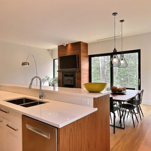 This home is strongly inspired from the Single Level inspiration. Located North of Montreal (Qc) in the Laurentians, this bungalow home has 10’ ceilings and 8’ aluminum windows throughout. The home features an open space combining kitchen, living room and dining room. Enjoy the peace and quiet of nature near the fireplace or in the summer room.