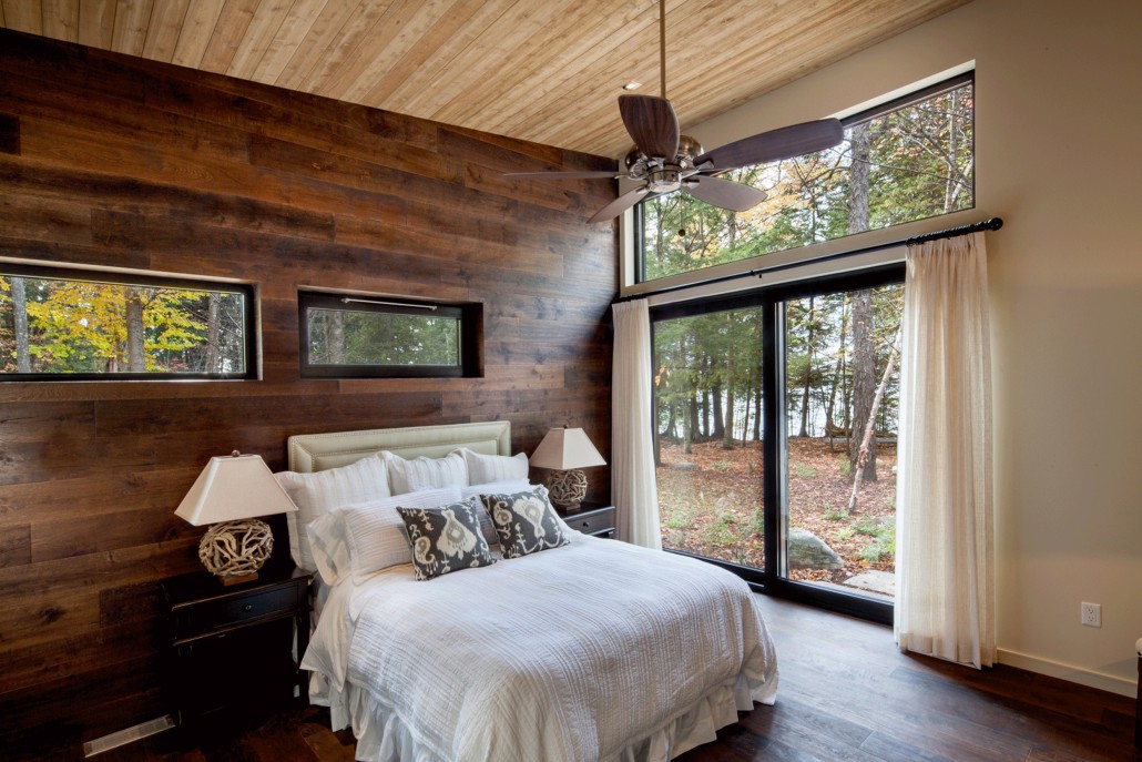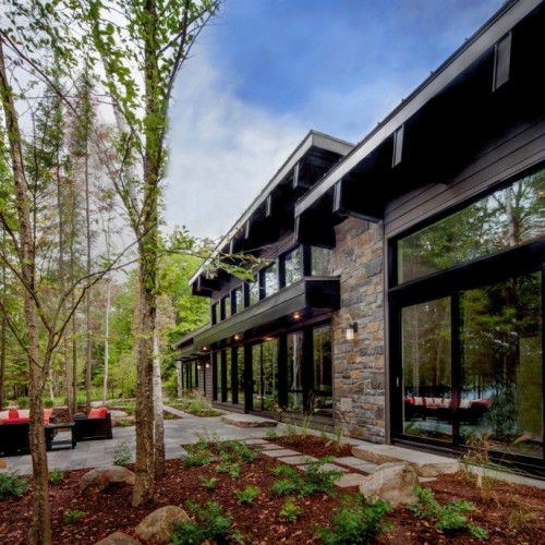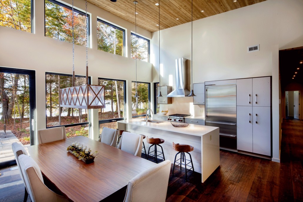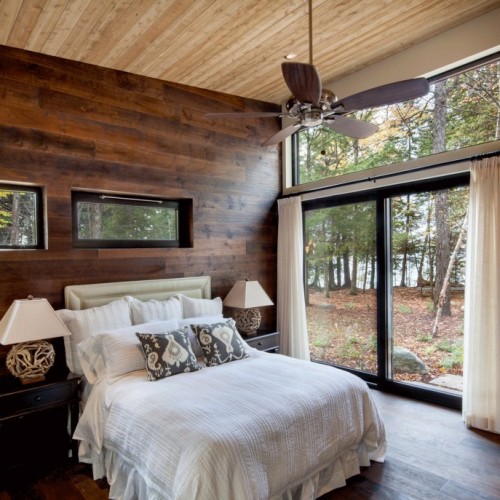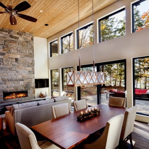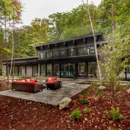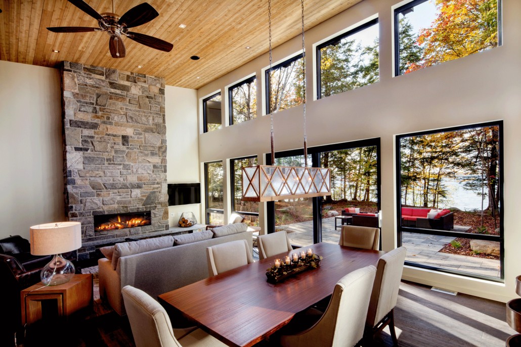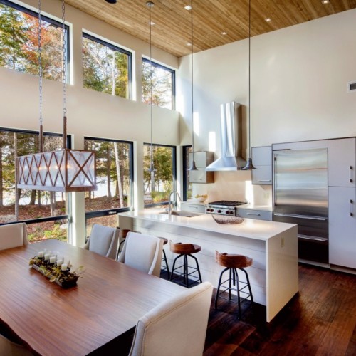 This custom design country home is located on an exclusive island in the Muskoka region of Ontario. This one-of-a-kind cottage is a dynamic mix of Muskoka-style luxury and modern design. The home has four bedrooms with lake view and large open-concept common space that invites nature inside.