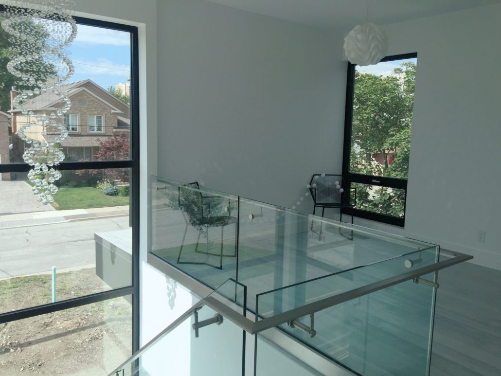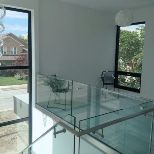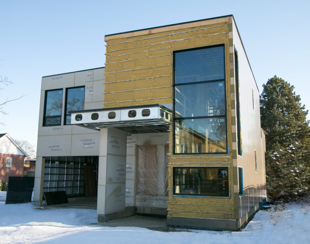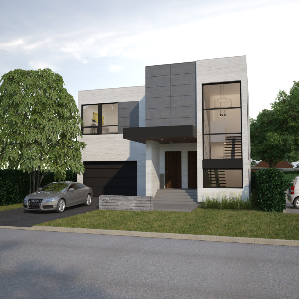 Located in Etobicoke, this two storey home has been designed with our Infill inspiration as a starting point. The home also features two bedrooms, a shared bathroom, and a laundry/utility room, with a mudroom shared between the garage entrance and the main entrance. There is a social space with higher ceilings on the upper floor and a single-car garage with a mudroom. The living room at the front of the building features a fireplace and is cantilevered over the entrance.