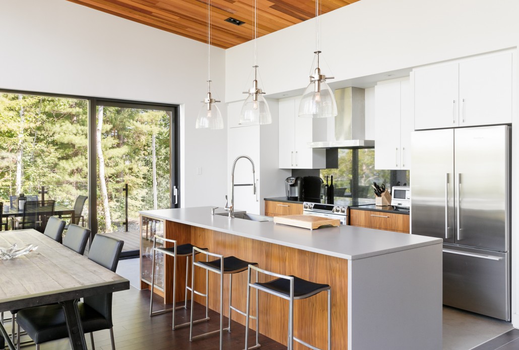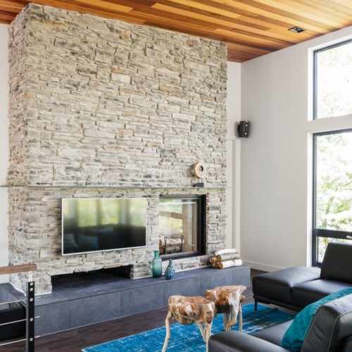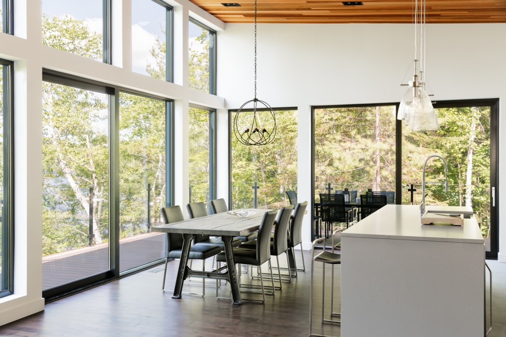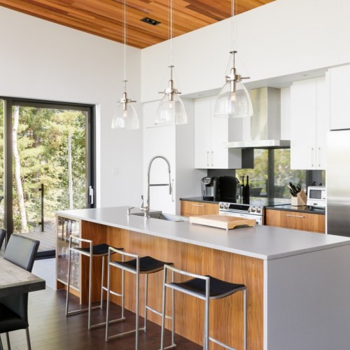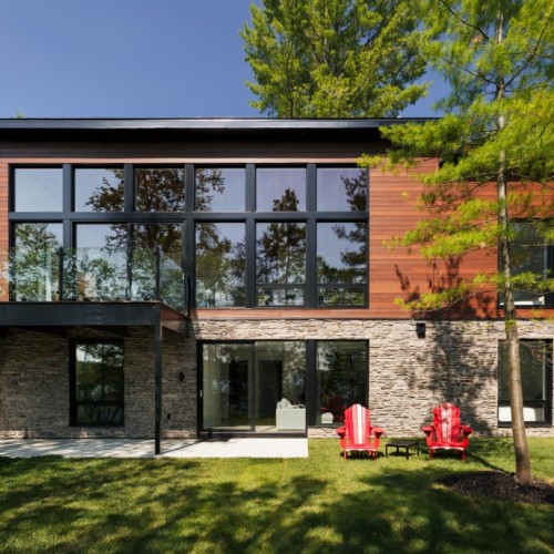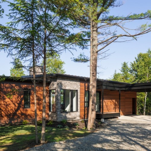 This beautiful secondary home overlooking a majestic lake is defined by its large windows and large open spaces. The optimized room configuration creates a warm and timeless design. The integrated outdoor terrace opens the interior living space onto nature’s canvas.